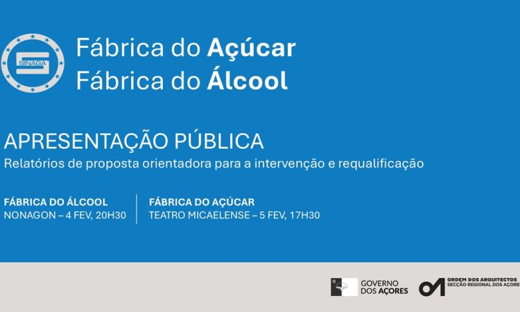 A Secretaria Regional das Finanças, Planeamento e Administração Pública e a Secção Regional dos Açores da Ordem dos Arquitetos promovem, a 4 e 5 de fevereiro, respetivamente na Lagoa e em Ponta Delgada, sessões públicas de apresentação dos Relatórios das Propostas Orientadoras para a Intervenção e Requalificação das Fábricas do Álcool e do Açúcar.
